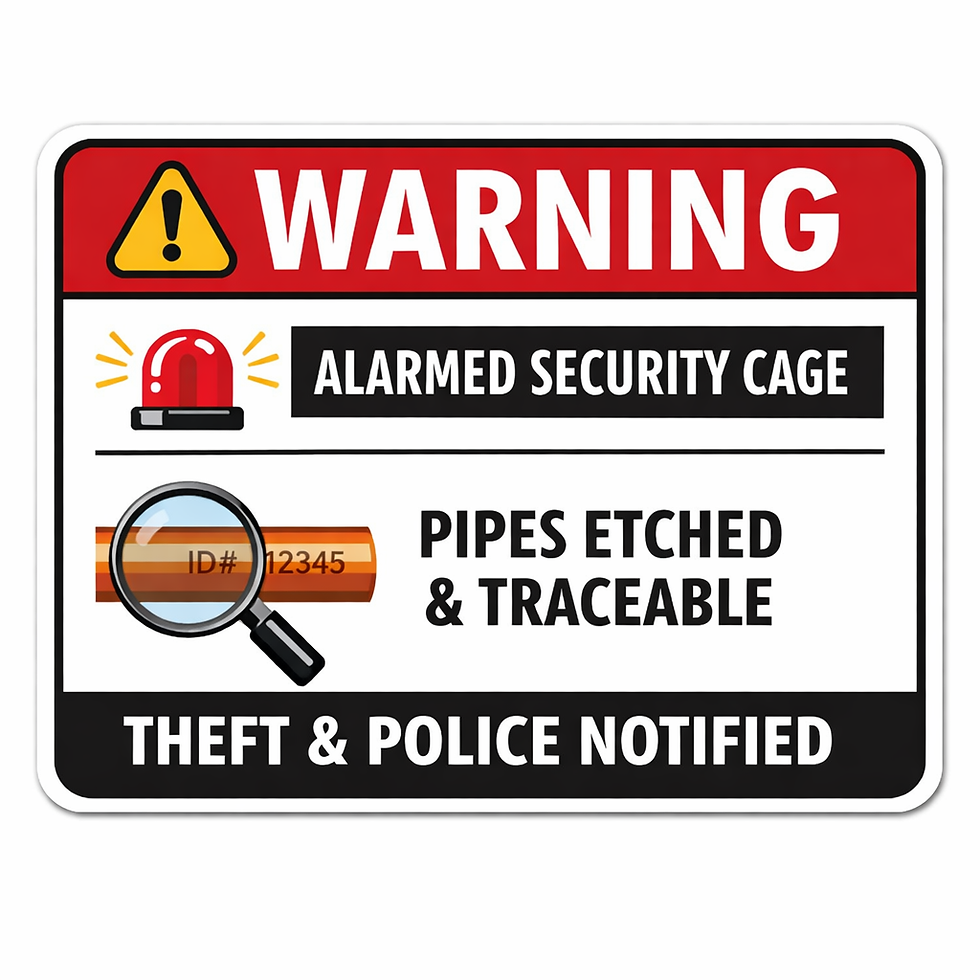 Simple warning signage can further strengthen deterrence. Signs stating that cages are alarmed and pipes are etched and traceable communicate that the equipment is monitored and that theft may lead to law enforcement involvement. Even inexpensive signs can influence opportunistic thieves to move on.